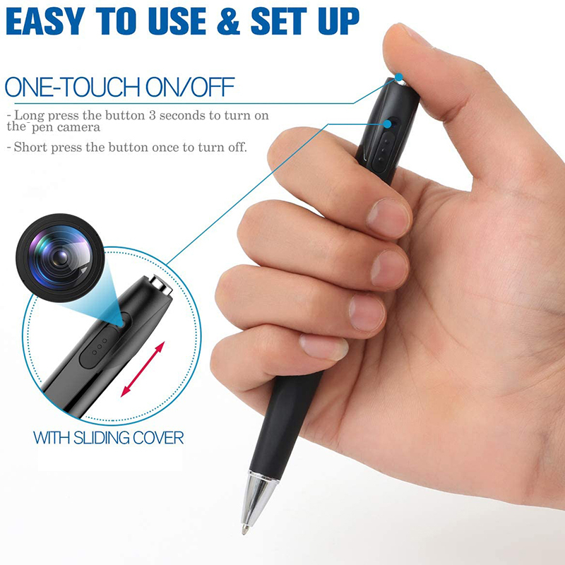 Den ser ut och fungerar precis som en vanlig bläckpenna men gömd i överdelen så finns det en kamera som diskret filmar viktigt bevis eller spännande händelser i 1080P-upplösning och klämman ser till att kameran inte skakar runt i fickan. Denna penna kan inte bara spela in video utan också ta foton. För att sätta på kameran så behöver du bara hålla inne knappen i 3 sekunder, sedan är det bara att klicka för att ta bilder eller dubbelklicka för att börja inspelningen.